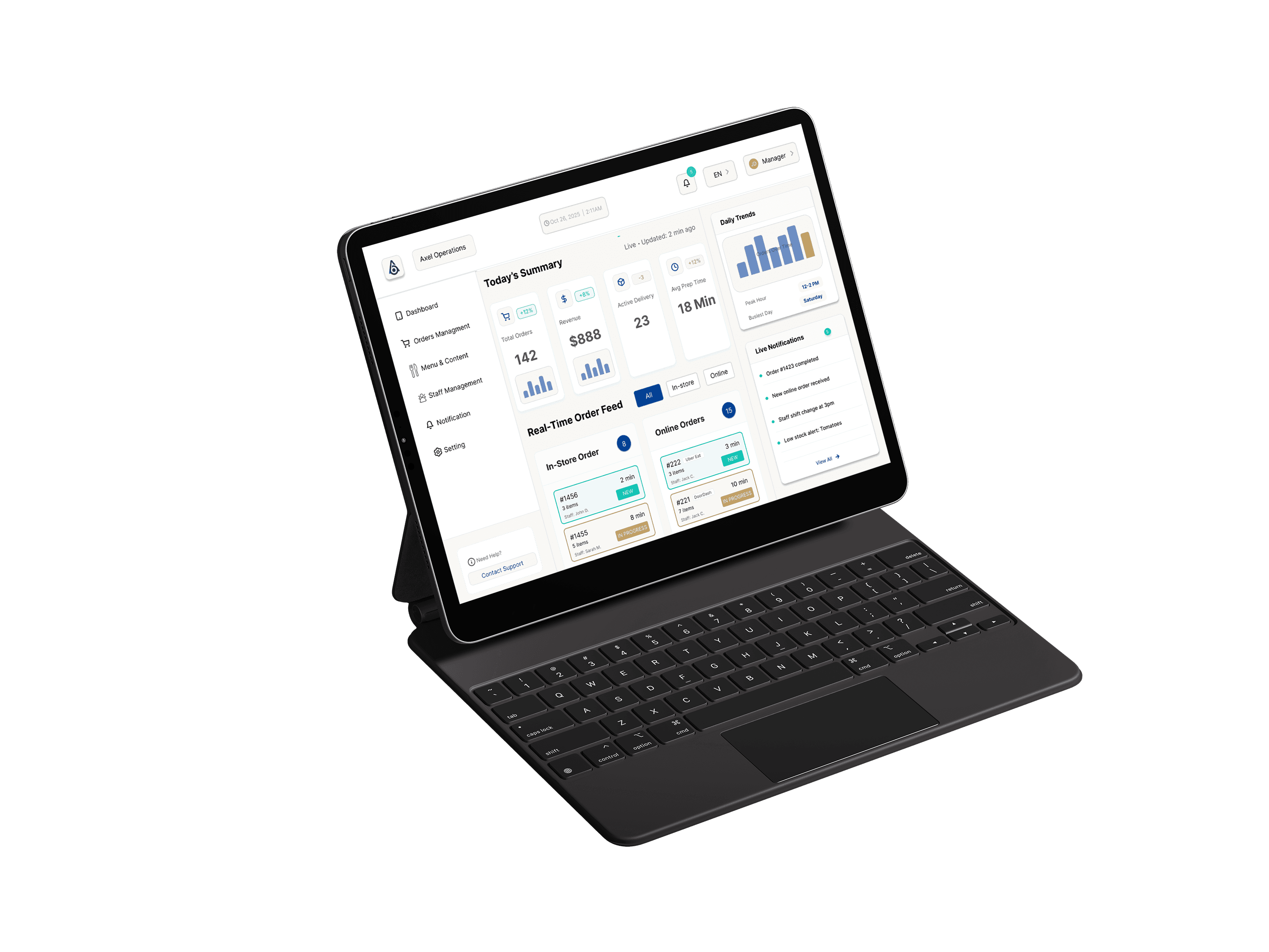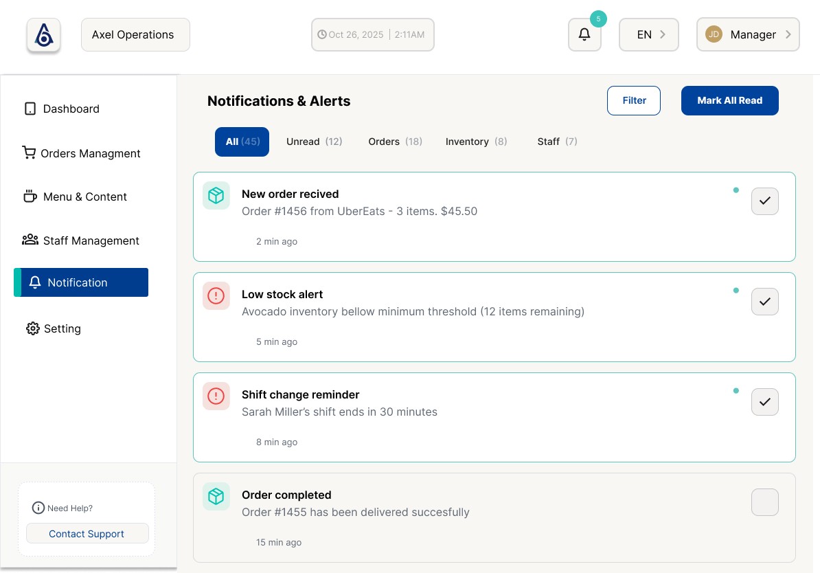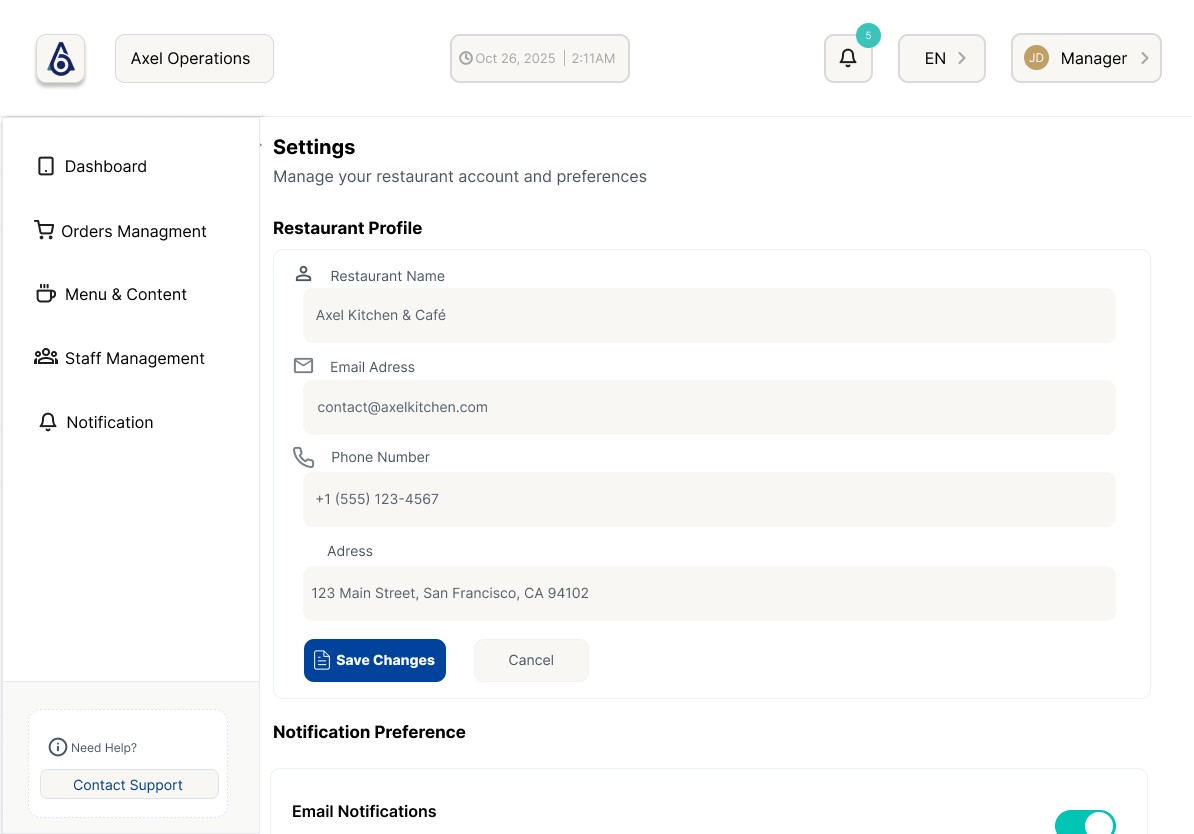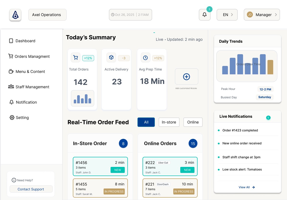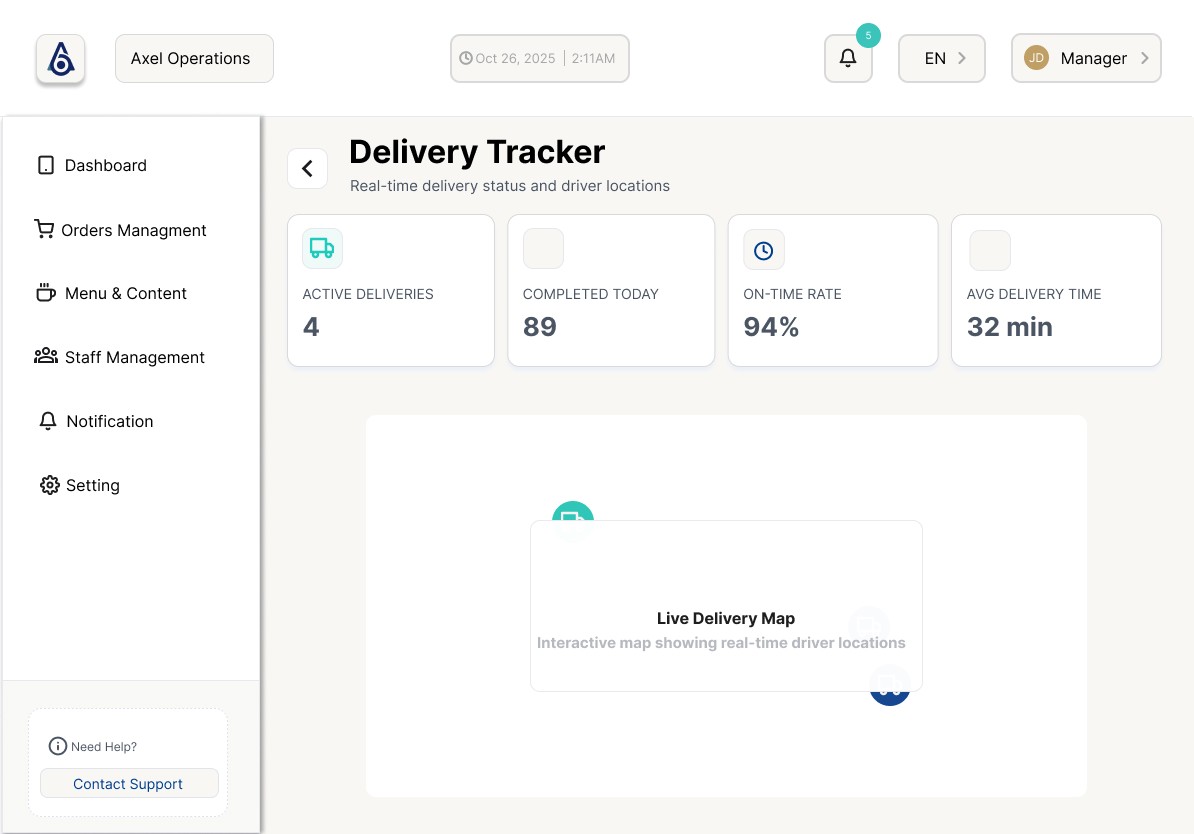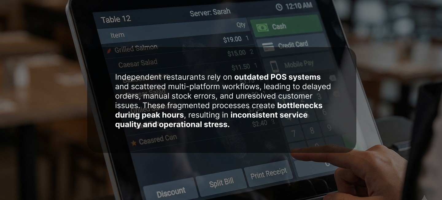 Streamlining restaurant operations through a unified, real-time dashboard for orders, kitchen workflows, and delivery logistics.