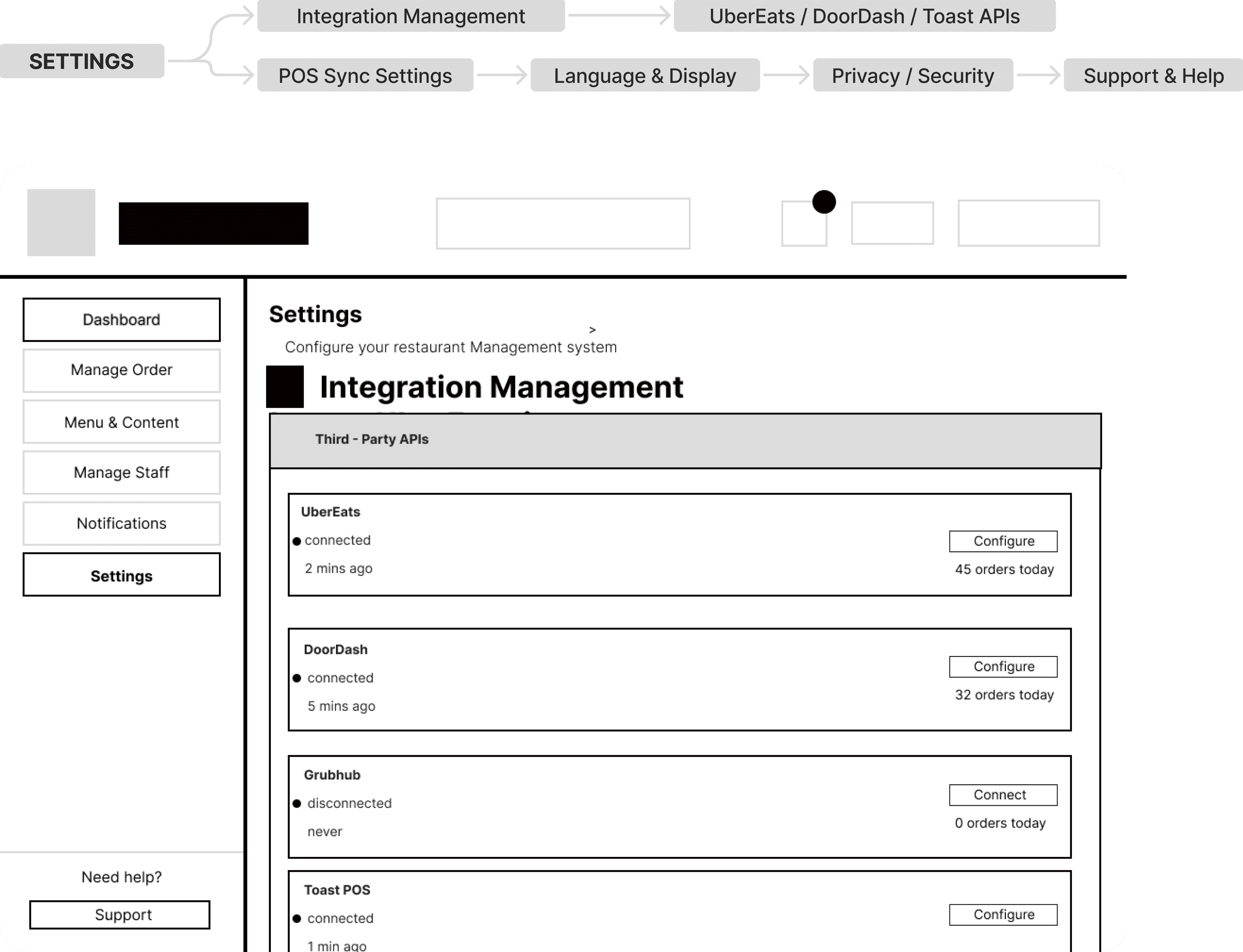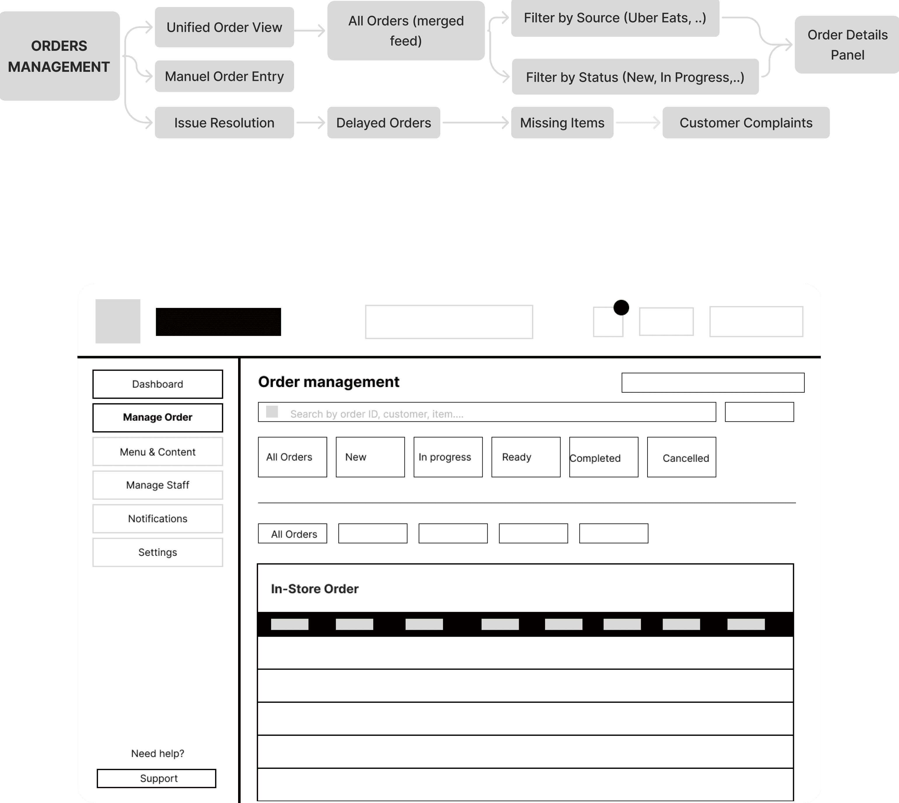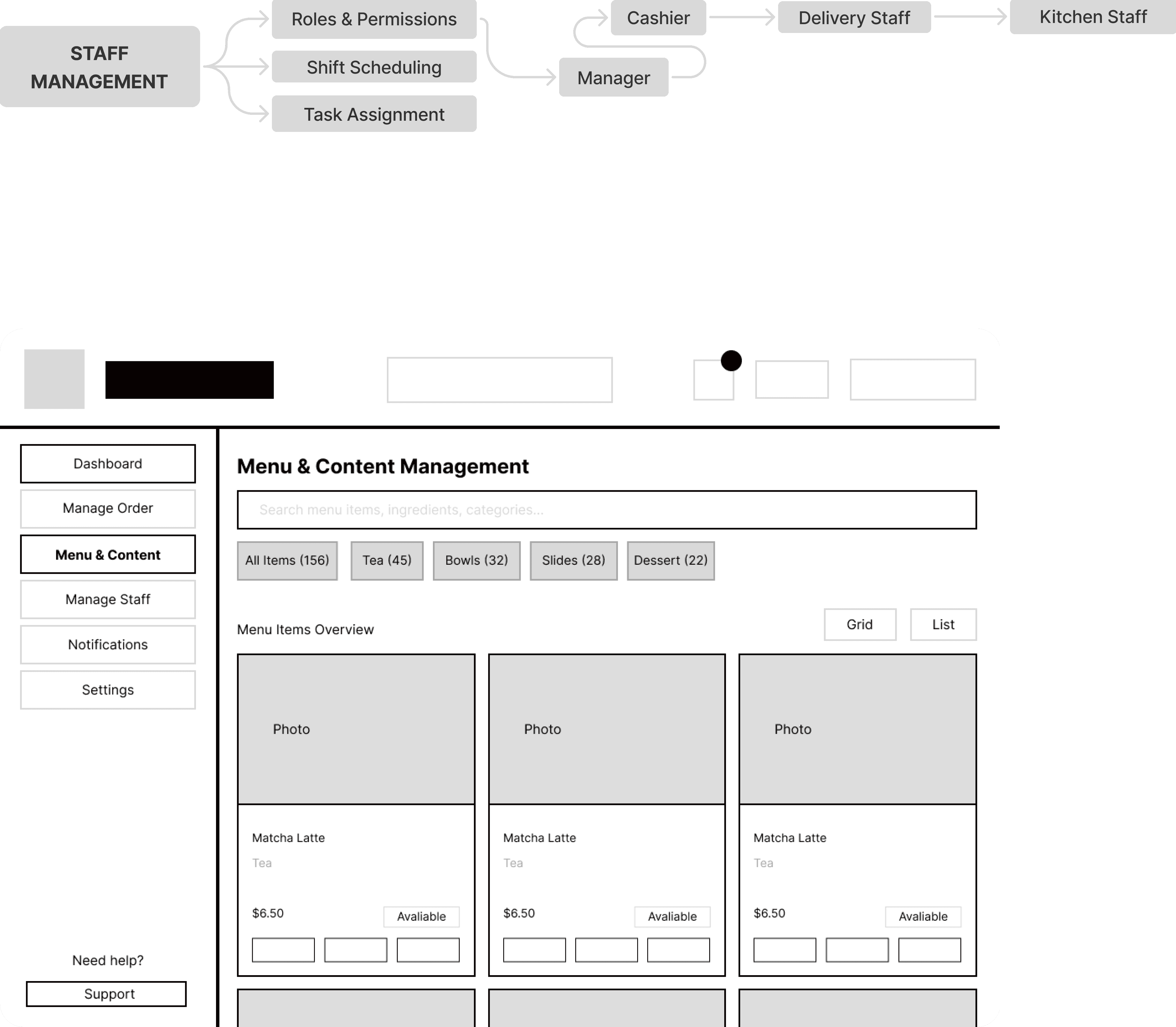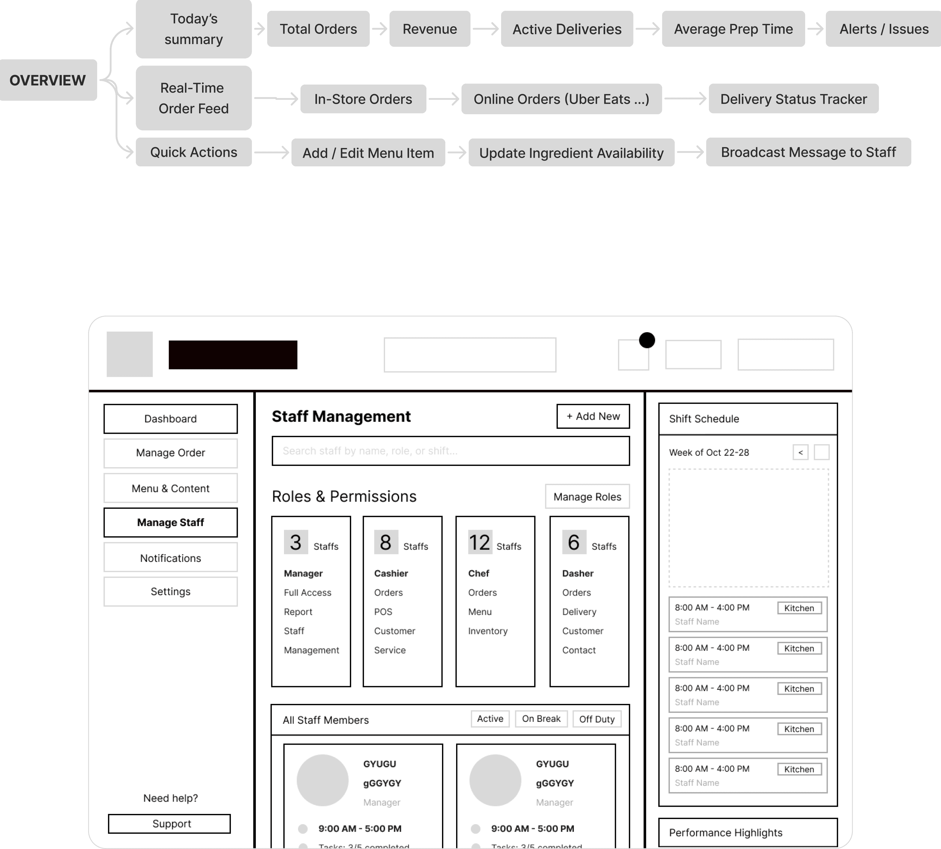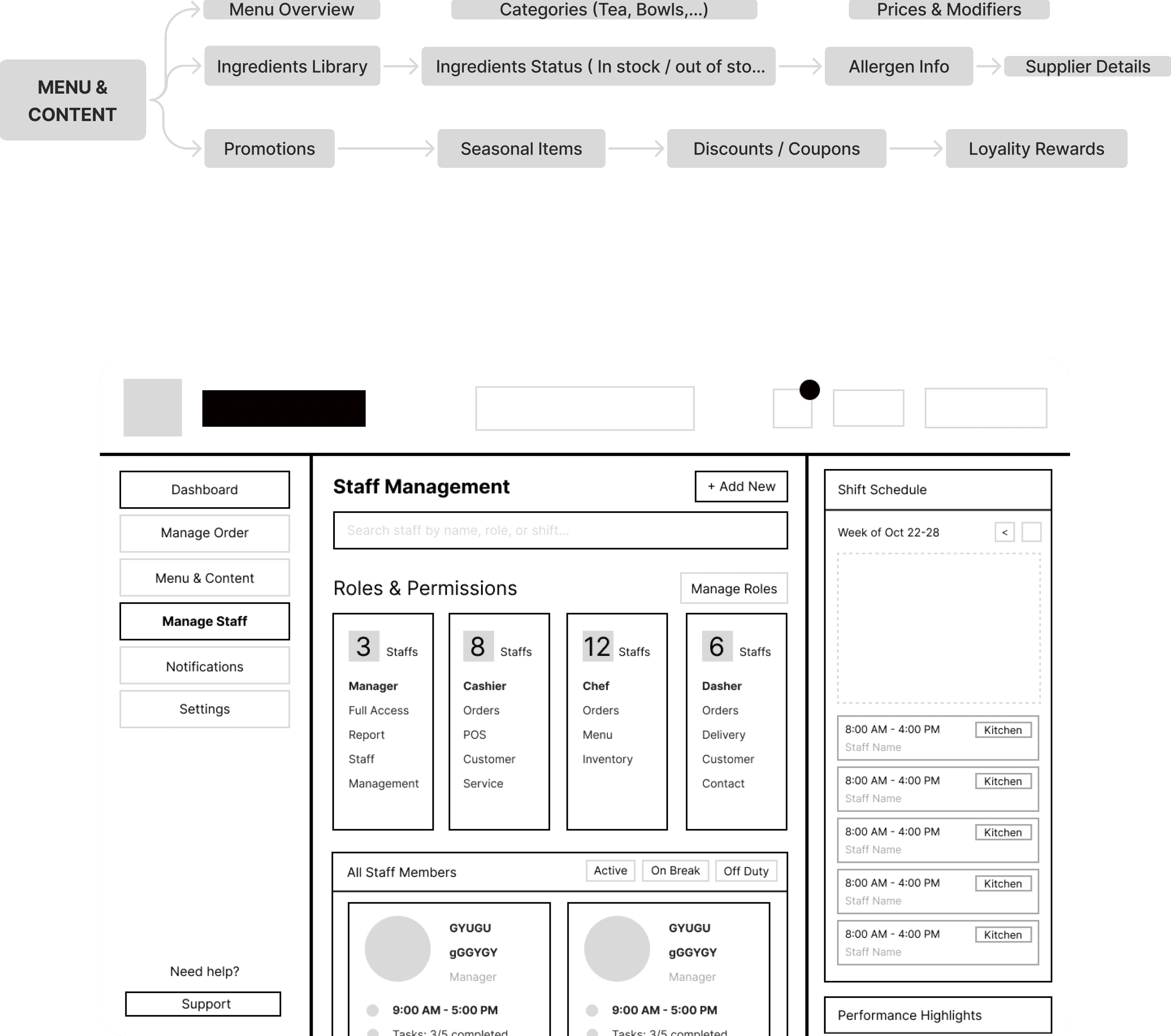 Translating the research data into a coherent structure required a multi-stage brainstorming process. We started with hand-drawn sketches to map the relationships between kitchen staff and front-of-house, then moved to formalized information architecture (IA) to define the platform hierarchy.