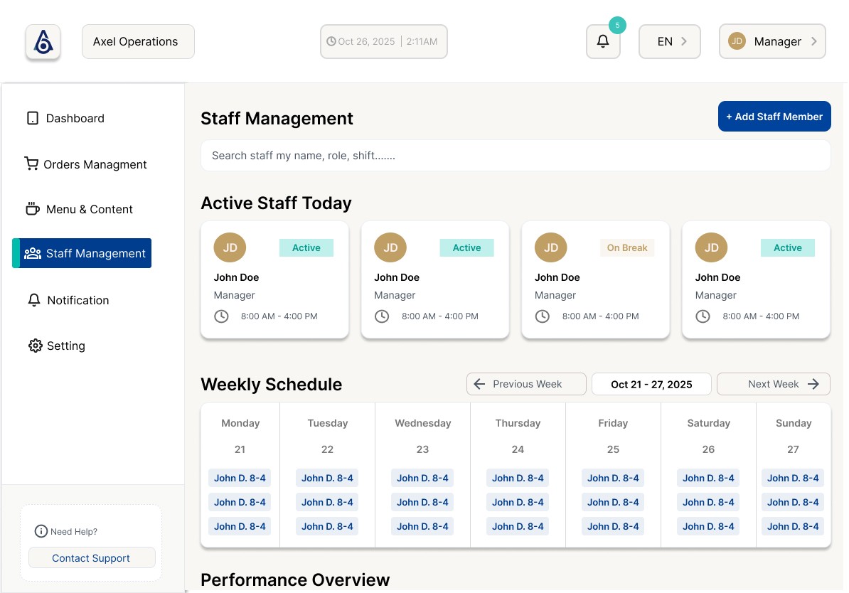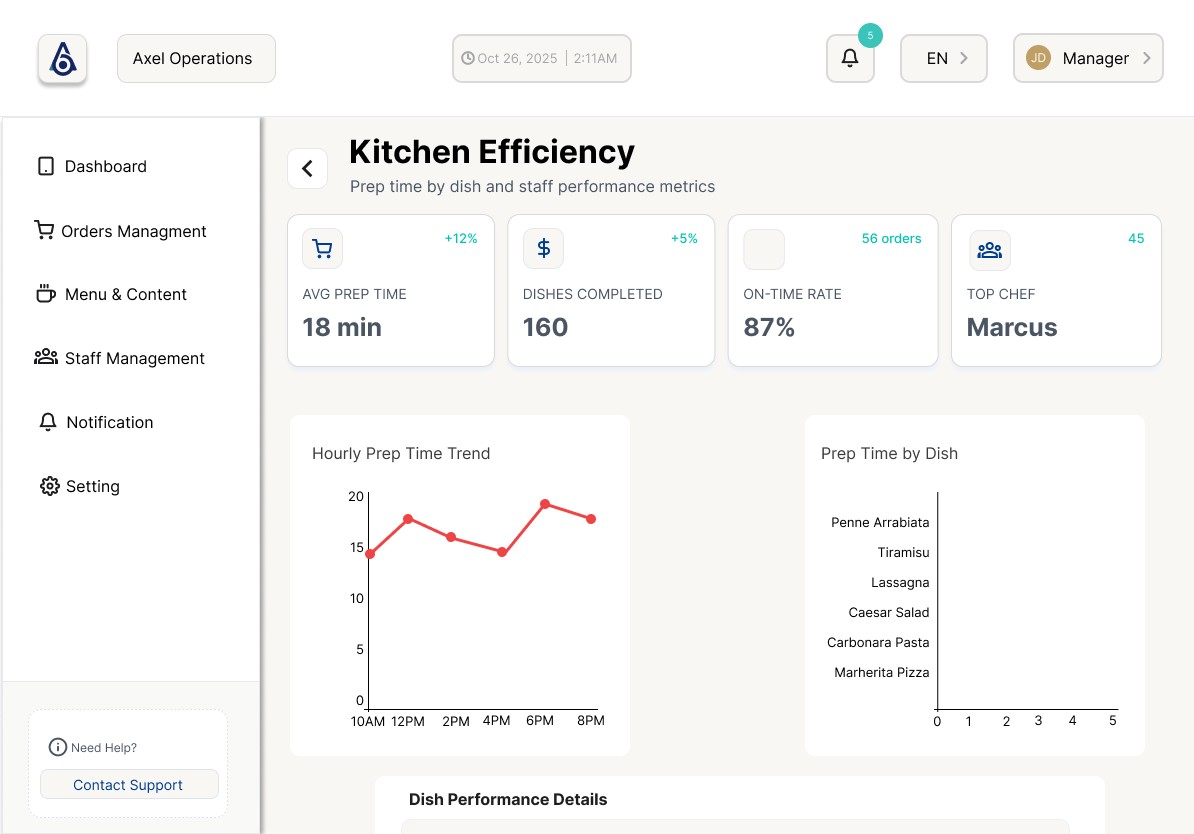 Axel is an restaurant operations system that helps independent restaurant owners understand their daily performance, identify emerging issues, and make confident decisions through clear, actionable insights.